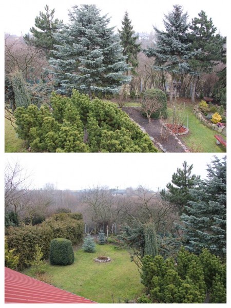 Zagospodarowana działka ? wieloletnie drzewa iglaste i krzewy, trawnik, klomby.