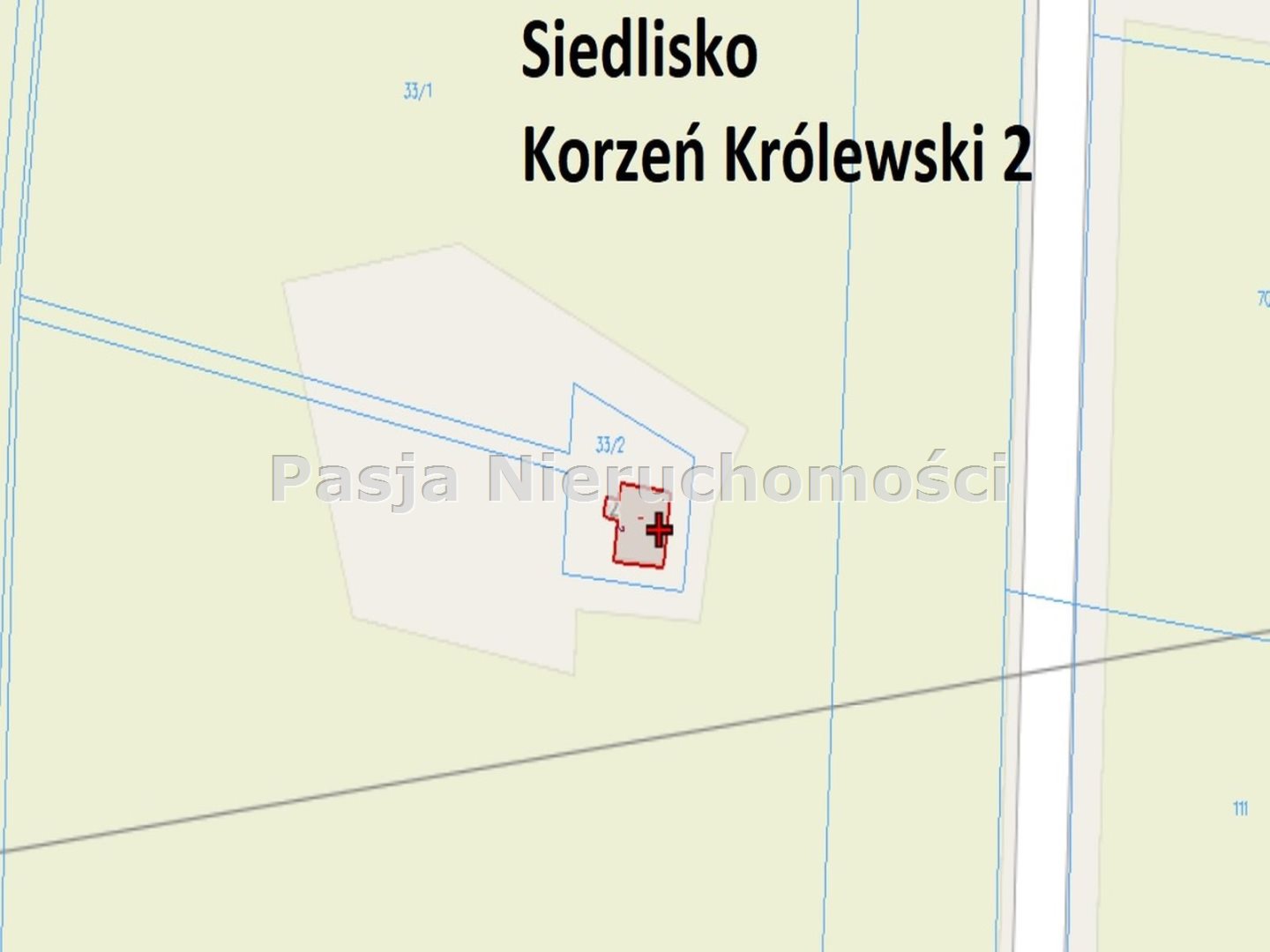 Dziaka numer 33/2 o powierzchni 947 m2 zabudowana budynkiem mieszkalnym, murowanym, parterowym z poddaszem.